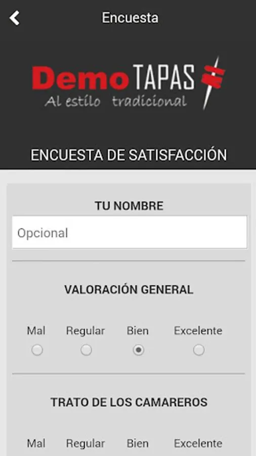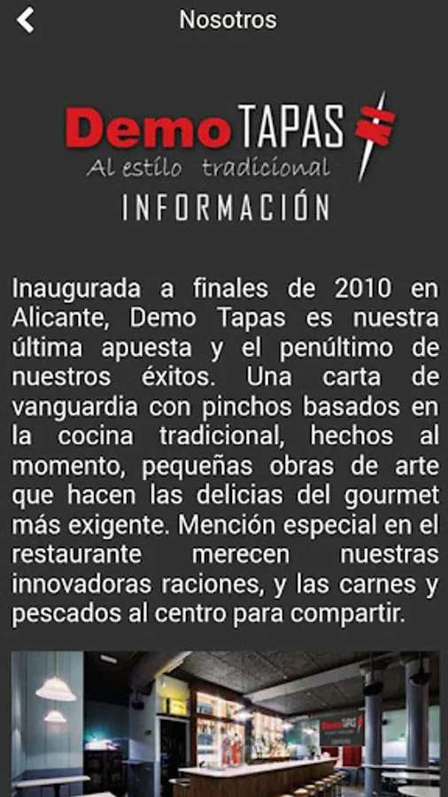 Tapas Demo APP APPLENTY mobile application is ideal for taperías, breweries, bars, pubs ... We customize the appearance of the APP to the corporate image of your business, logo, colors, features, etc. It includes an effective system of promotions and seals by which get increased influx of customers to your site. Table reservation, satisfaction survey, events ... All information and consultation in www.applenty.es.