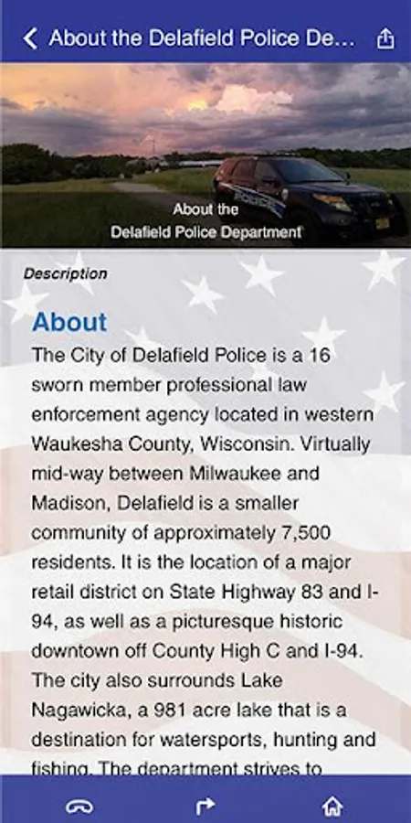 The City of Delafield Police is a 16 sworn member professional law enforcement agency located in western Waukesha County, Wisconsin. Virtually mid-way between Milwaukee and Madison, Delafield is a smaller community of approximately 7,500 residents. It is the location of a major retail district on State Highway 83 and I-94, as well as a picturesque historic downtown off County High C and I-94. The city also surrounds Lake Nagawicka, a 981 acre lake that is a destination for watersports, hunting and fishing. The department strives to provide comprehensive community oriented policing services while being equitable in the enforcement of local ordinances and state statutes.