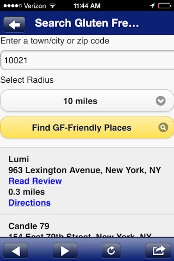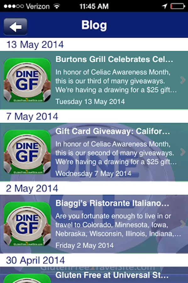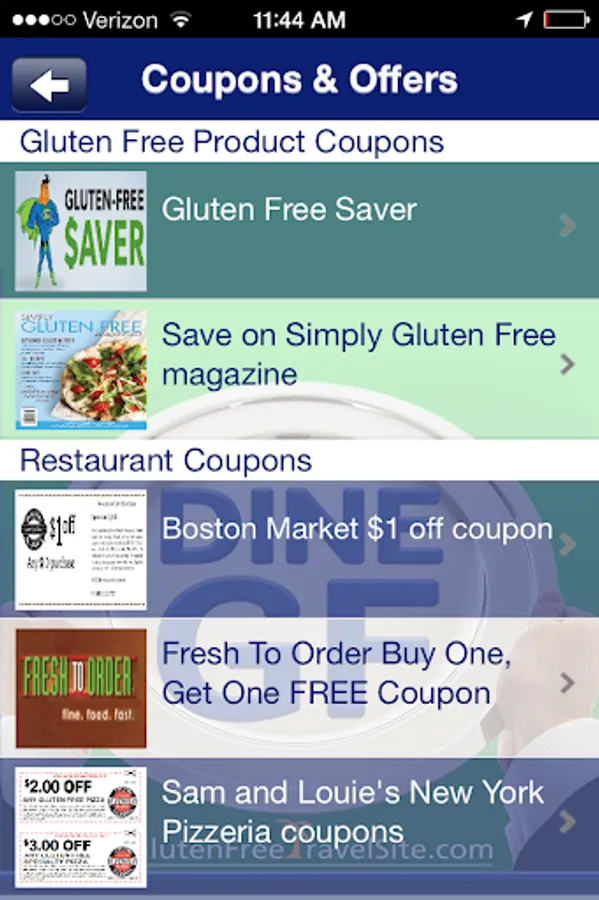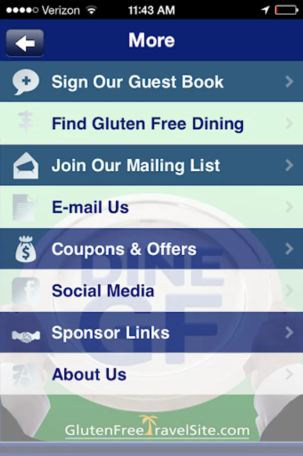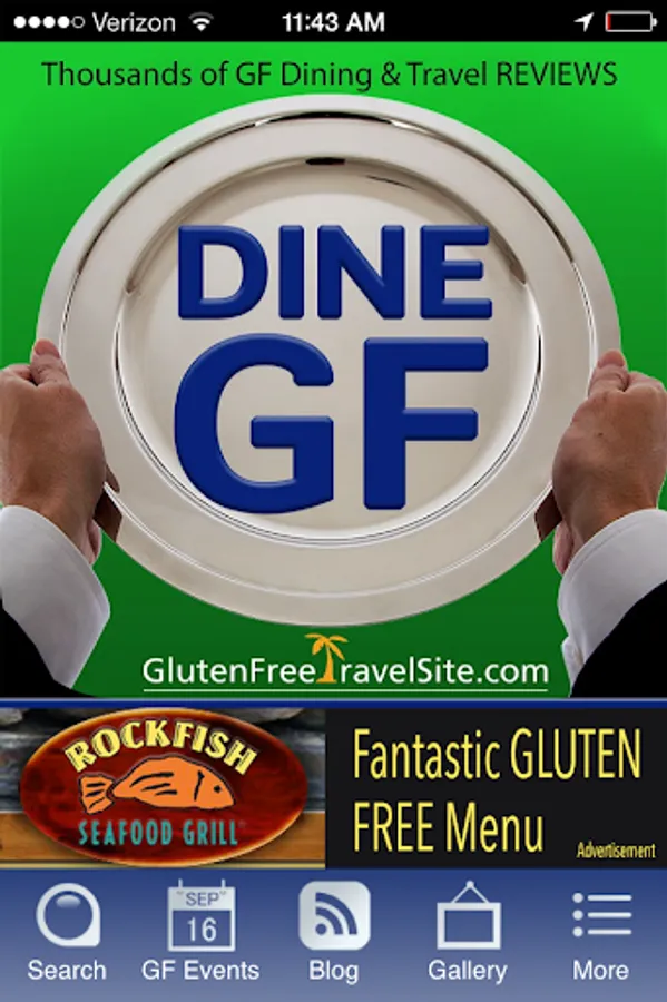 DINE GLUTEN FREE by GlutenFreeTravelSite lets you access our huge database of Gluten Free Restaurant & Travel REVIEWS from the U.S. -- and around the world -- when you're on-the-go. GlutenFreeTravelSite is the original website devoted to showcasing user-submitted reviews of "gluten free friendly" restaurants, bakeries, markets, hotels, resorts, B&Bs, and cruises. Because every business is REVIEWED by someone following a gluten free diet, you get first-hand, personal, and helpful feedback. Search by town or zip code, and GF-friendly places that have been reviewed will appear in a listing in order of proximity. Click on any business to read the review, map it, share it, or add to your reminders. In addition to searching any town/city, you can also choose "Search Outside the U.S." to do a broad search by province, country, or region. DINE GLUTEN FREE even makes it easy to submit a dining review of your own right from the app. You’ll also find dedicated pages for Restaurant Chains with Gluten Free Menus, Coupons, a Calendar of GF events, posts from our Gluten Free Travel Blog, and a streaming gluten free News Feed.