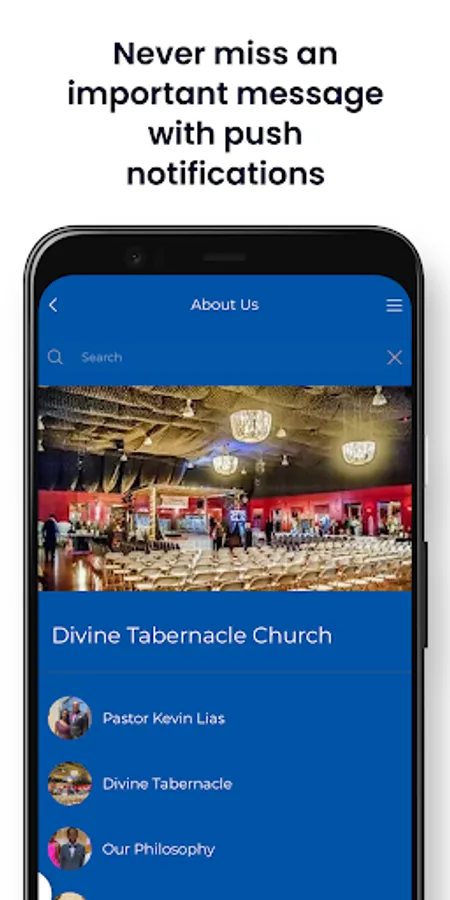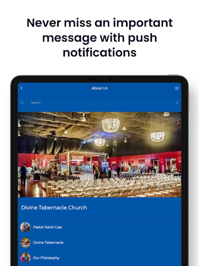 • Push Notification Messaging - receive messages containing important church information while on the go.
