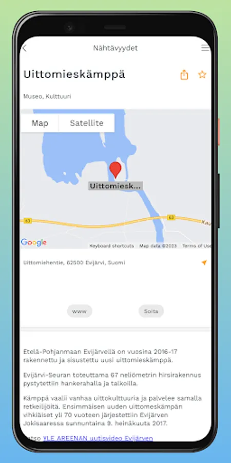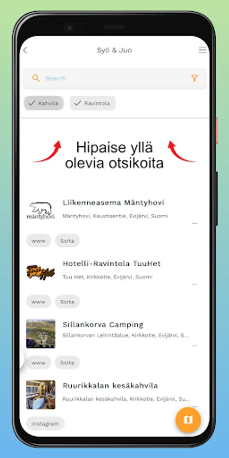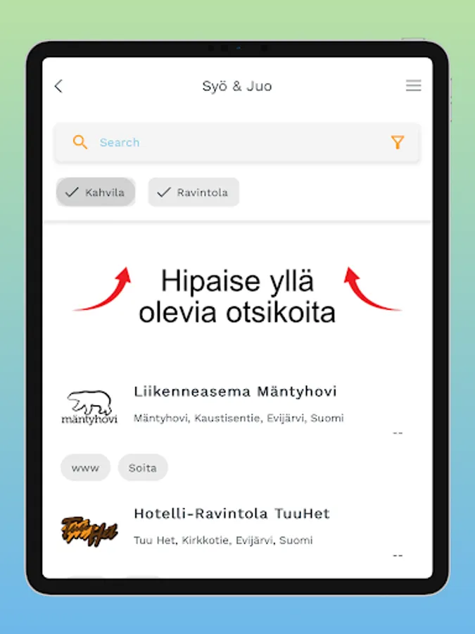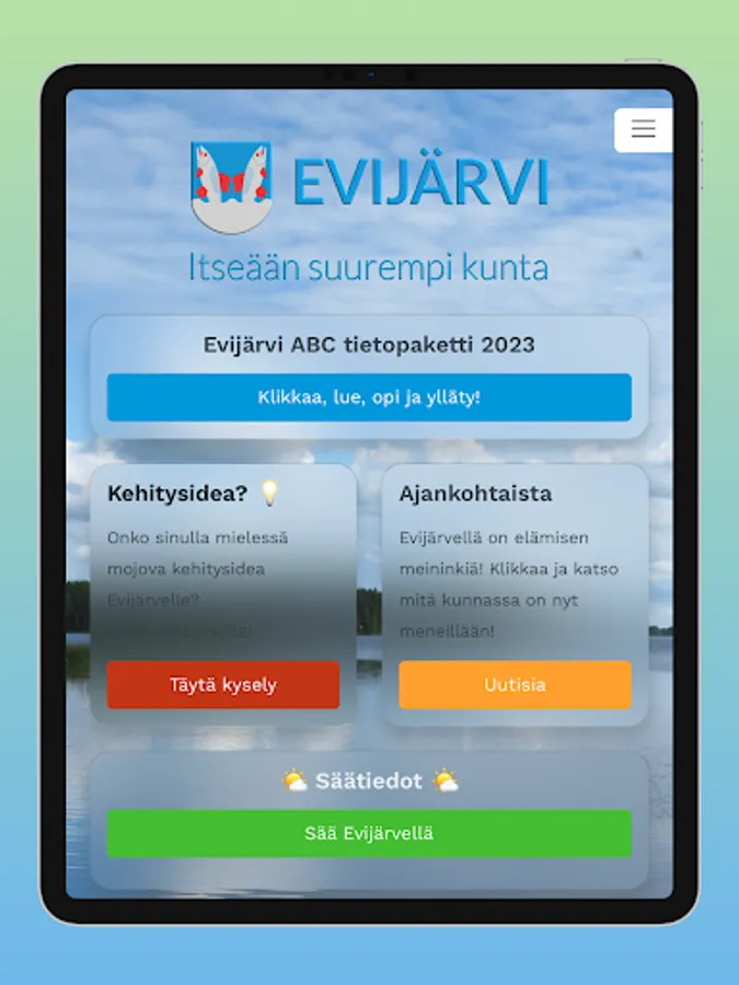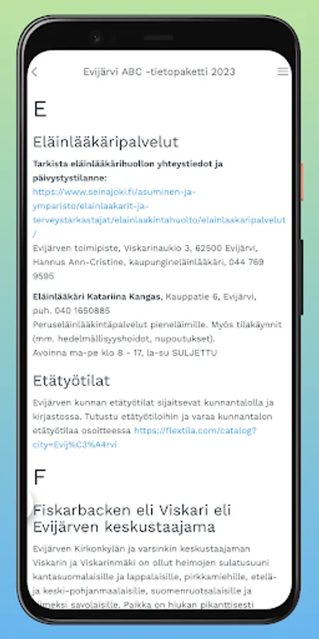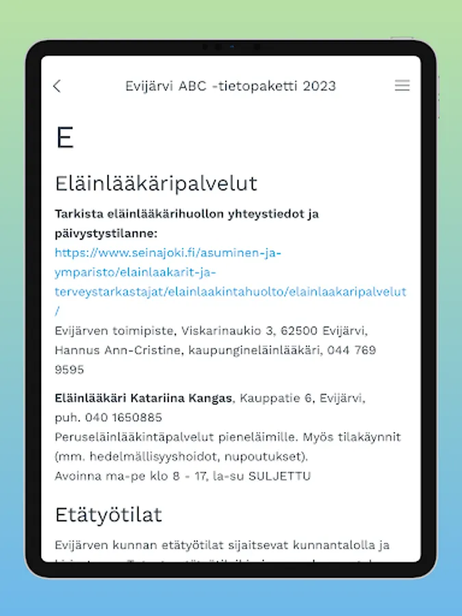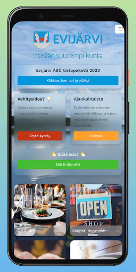 This free Evijärvi application brings up-to-date information about the municipality's events, services and news to your phone in an easy-to-use way that effectively utilizes the device's features! With the help of the application, you can see the locations and distances of the services on the map, and with a couple of taps you can start a call, email or navigate to your desired destination. By accepting PUSH messages, you can also receive bulletins, messages and useful news!