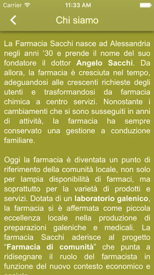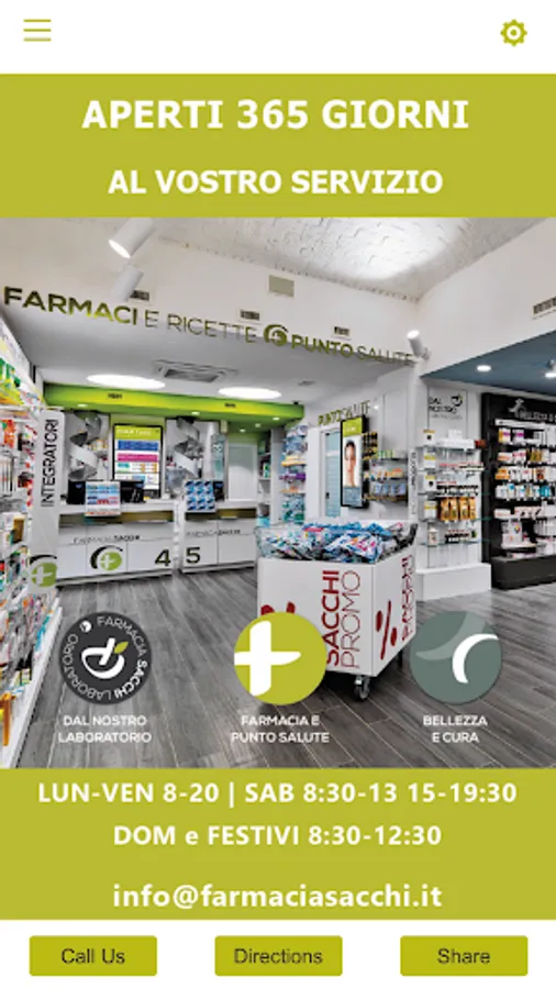 - Social: to connect to the social pages of Pharmacy Sacchi