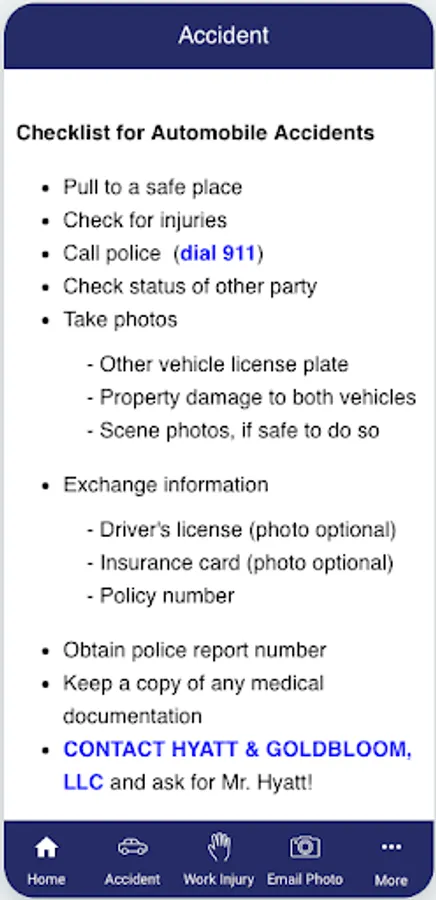 This app includes tools for use in auto accident or work place injury including sending details, photos and voice reports, directions to our office and receiving push notification messages.