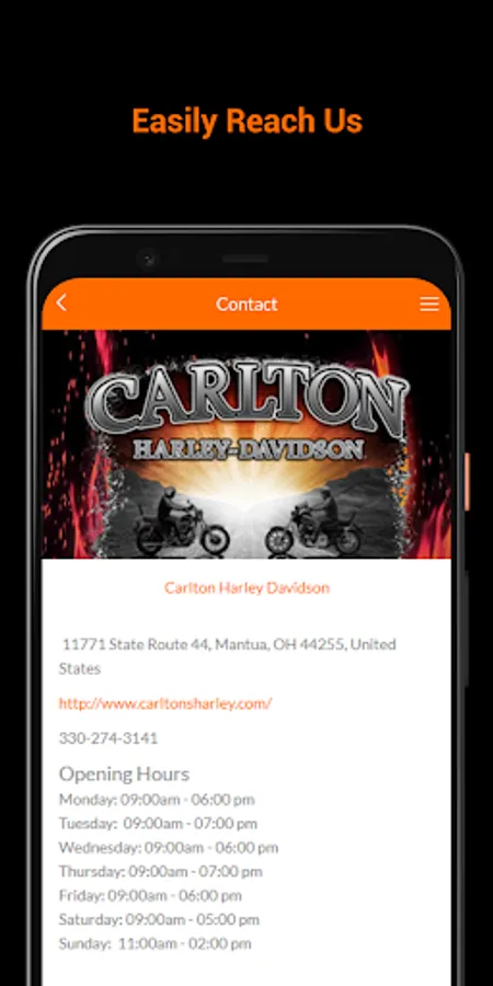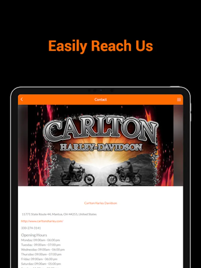WELCOME TO CARLTON HARLEY-DAVIDSON Carlton Harley-Davidson is a family owned and operated dealership since 1977. We are dedicated to delivering the greatest customer experience to all our customers. At Carlton Harley-Davidson, we have a great selection of parts, accessories, clothing, gift items, new and used motorcycles. We are located 45 minutes from Cleveland, and 30 minutes from Akron. So if you are planning a ride, Mantua and surrounding cities has a lot to offer. We are primarily a farming community, so there are plenty of scenic views, perfect for an afternoon ride.