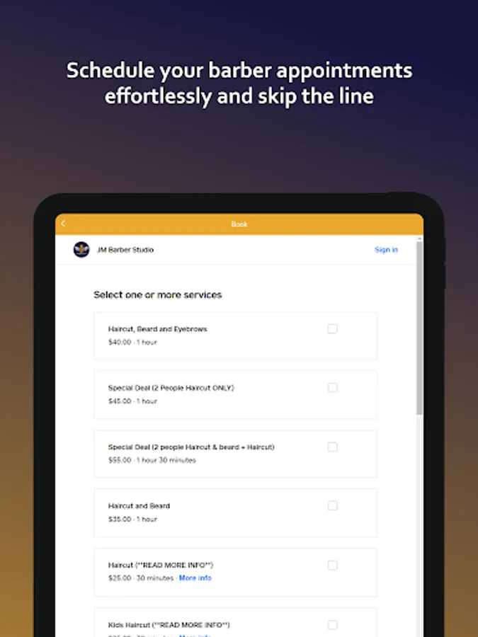 The all new JM Barber Studio App will allow customers to set appointments. Never wait on line again! This App also will allow you to get notifications regarding events, promotions and special announcements.