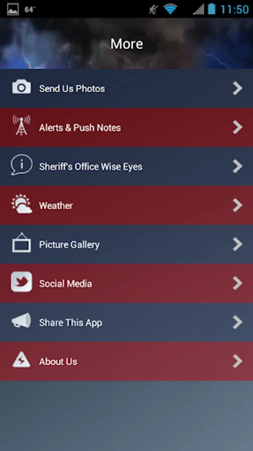 - Additional functions let you send emergency management pictures of what you see, check the weather, link to our social media, or check an event calendar to see what events are planned across the county.