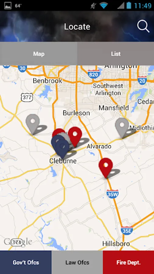 - Locate button helps you find local fire departments, law enforcement agencies or government office’s with just a touch