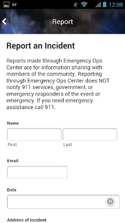 Reports made through Emergency Ops Center are for information sharing with members of the community. Reporting through Emergency Ops Center does NOT notify 911 services, government, or emergency responders of the event or emergency. If you need emergency assistance call 911.