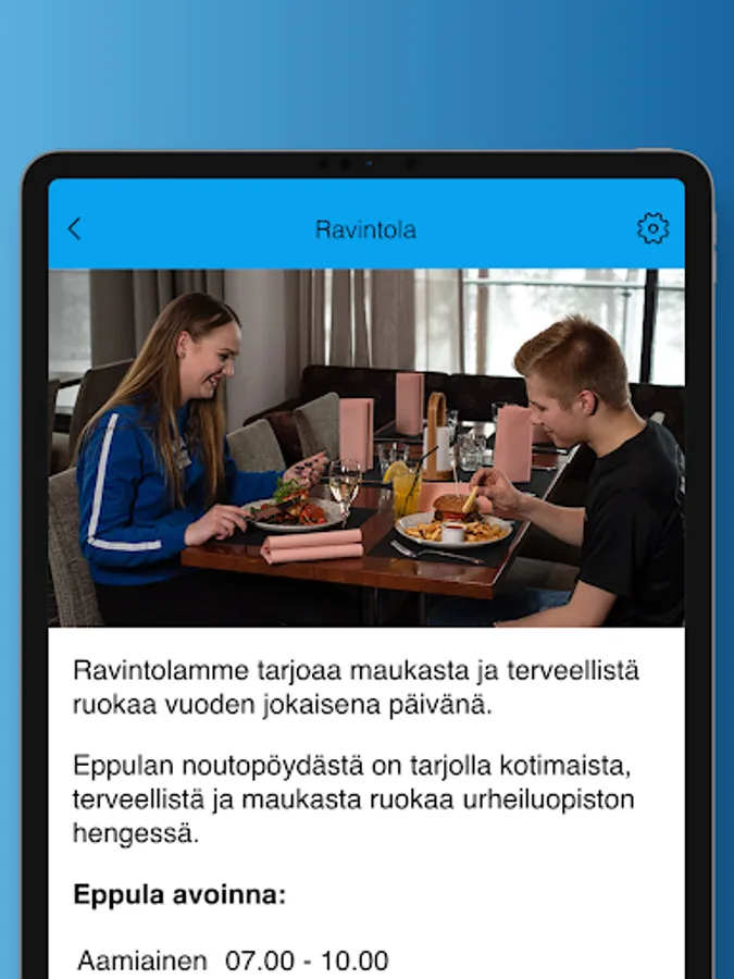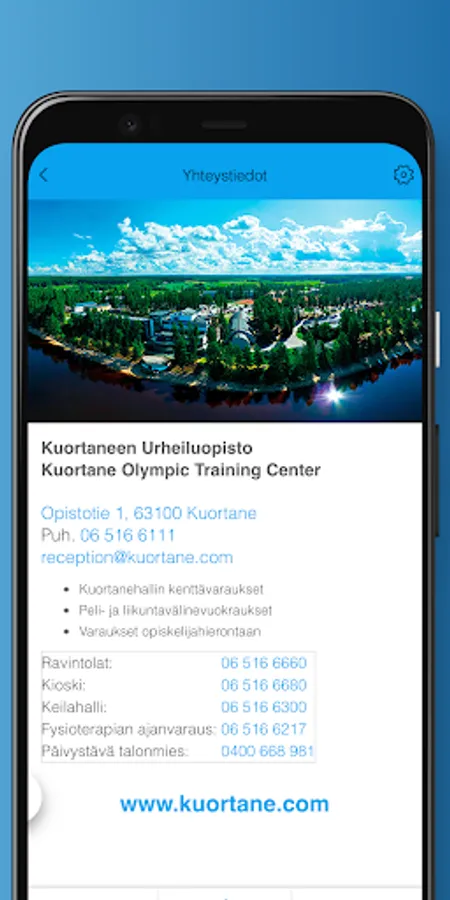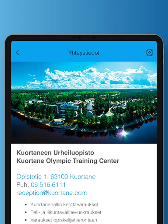 This mobile application is a database of services and events at the Kuortane Sports Institute. You will find it among others. links to our online store, room folders, up-to-date menus and more!
