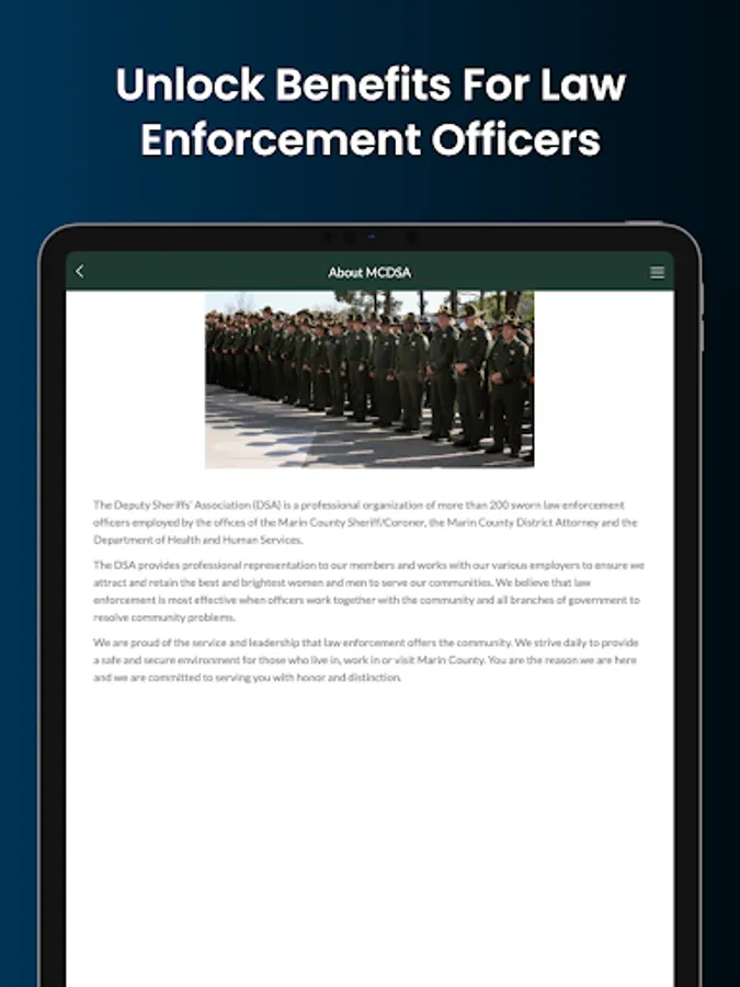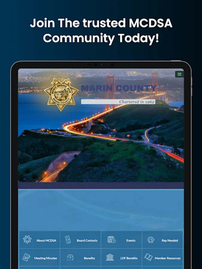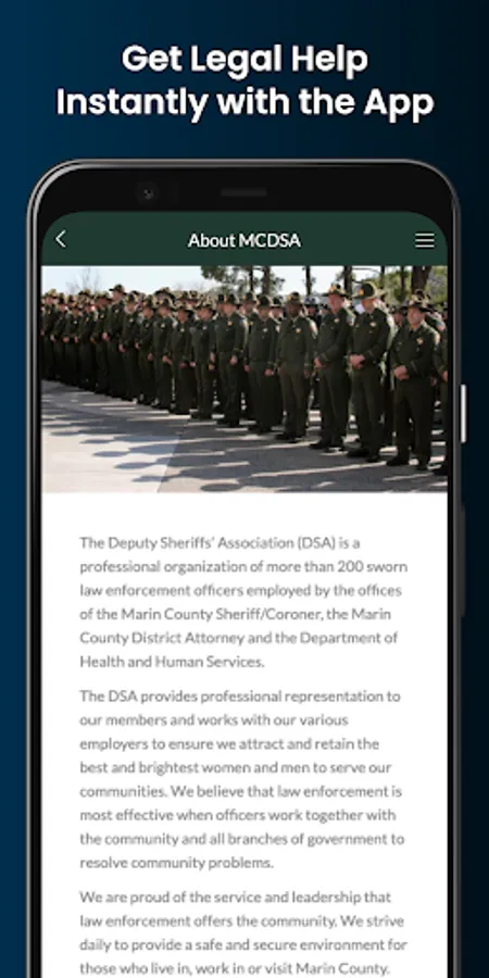 The Marin County Deputy Sheriffs' app enables members to stay up to date on union events, benefits, resources and more. It also provides the ability to easily contact a MCDSA rep and obtain legal assistance.