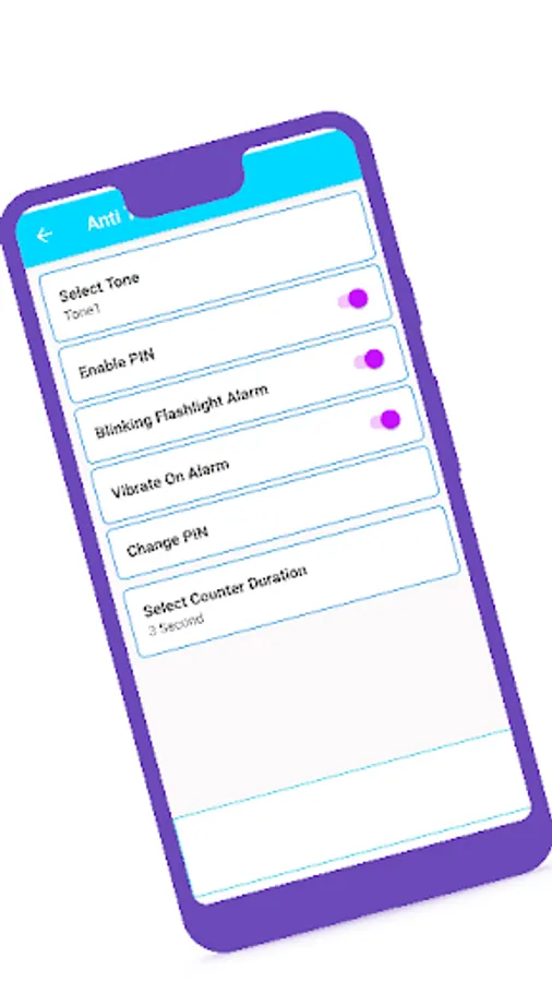 Four Digit Secret Pin Service is also available in Don’t Touch My Phone Motion Alarm you can enable the secret pin from setting and enter four-digit secret code.