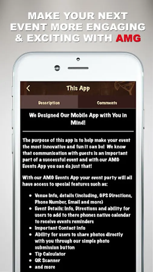 Welcome to the AMG Events Mobile App where we help you engage more with your guests for the big event! In our mobile you can access your events details with your unique Event Login Username and Password. If you are new to our program you can find out more about us by selecting Guest Access.
