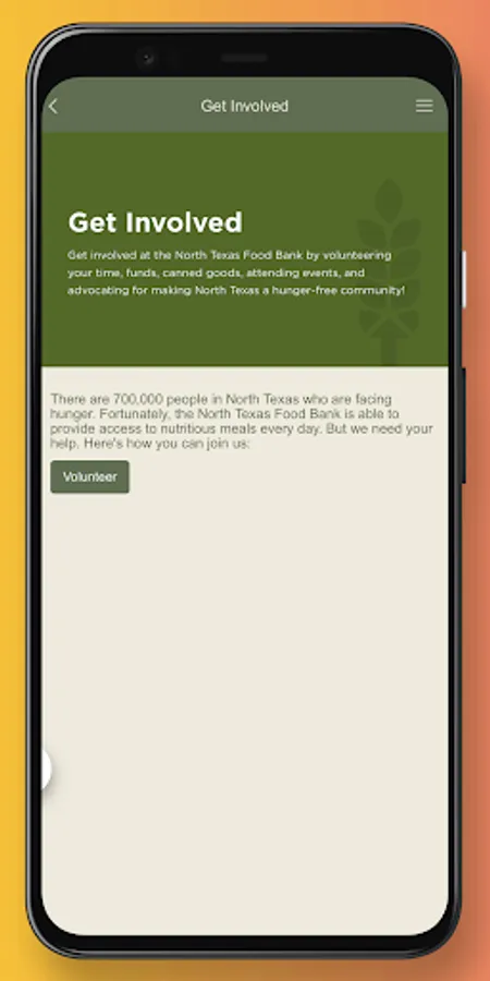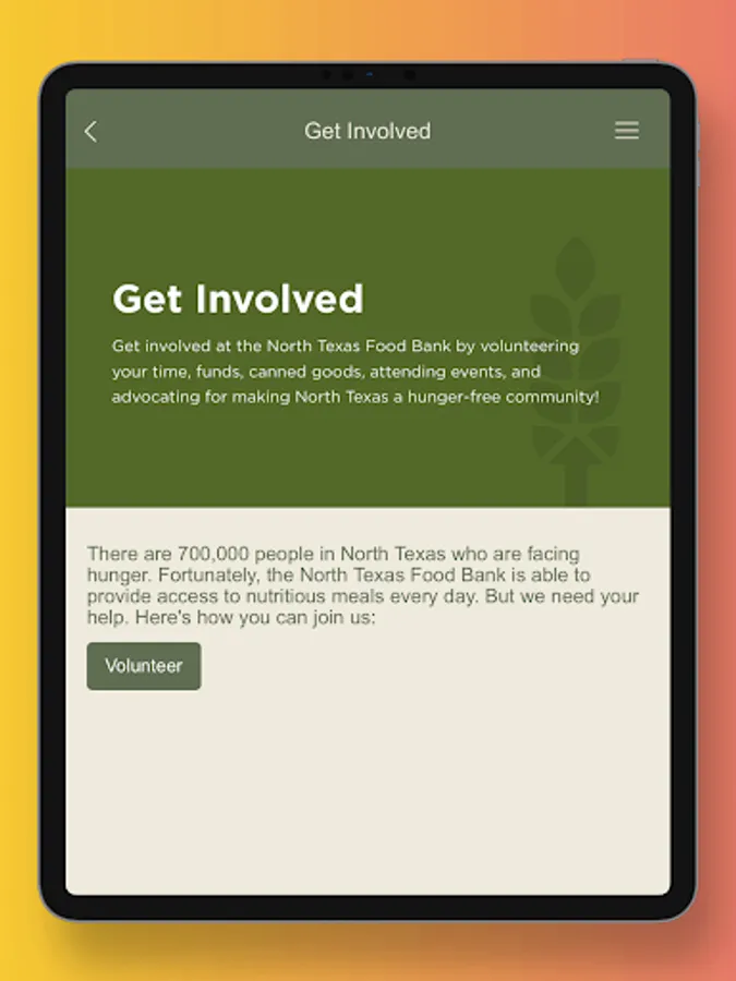 The North Texas Food Bank app is the best way to partner with us to fight hunger! This app has all the tools and information you need to stay connected to the North Texas Food Bank! Some of our app's features include: