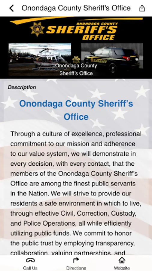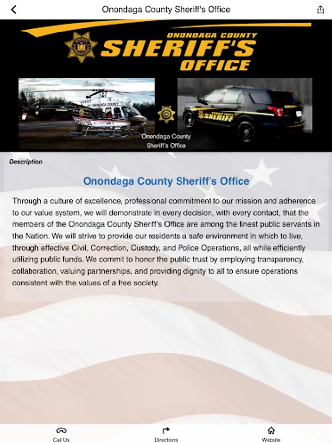 The Onondaga County Sheriff’s Office are among the finest public servants in the nation and strive to provide our residents a safe environment in which to live, through effective Civil, Correction, Custody, and Police Operations, all while efficiently utilizing public funds. We commit to honor the public trust by employing transparency, collaboration, valuing partnerships and providing dignity to all to ensure operations consistent with the highest of values. On behalf of the employees of the Onondaga County Sheriff’s Office, welcome to our app.