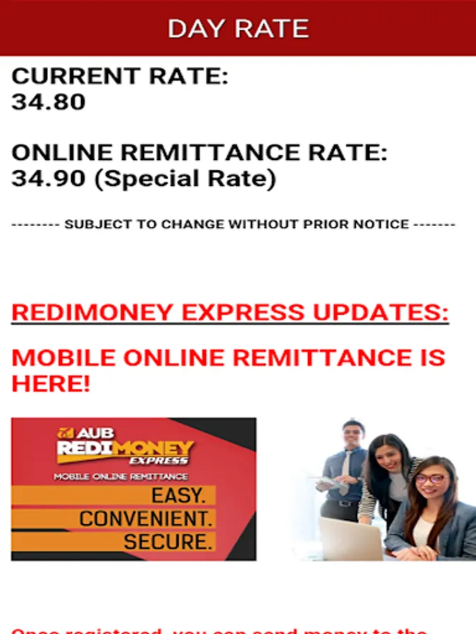 REDIMONEY Express provides services through Asia United Bank (AUB), CTB and other Banks.