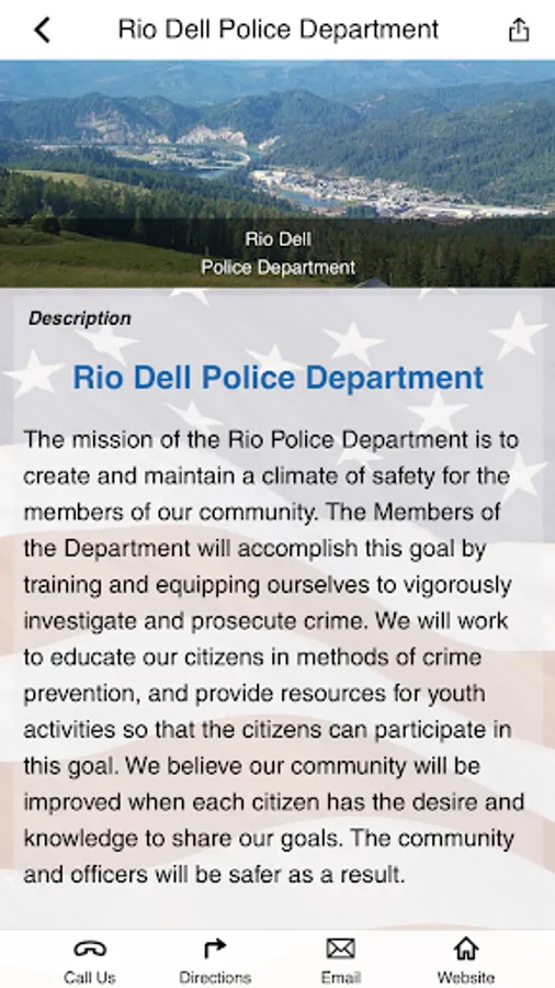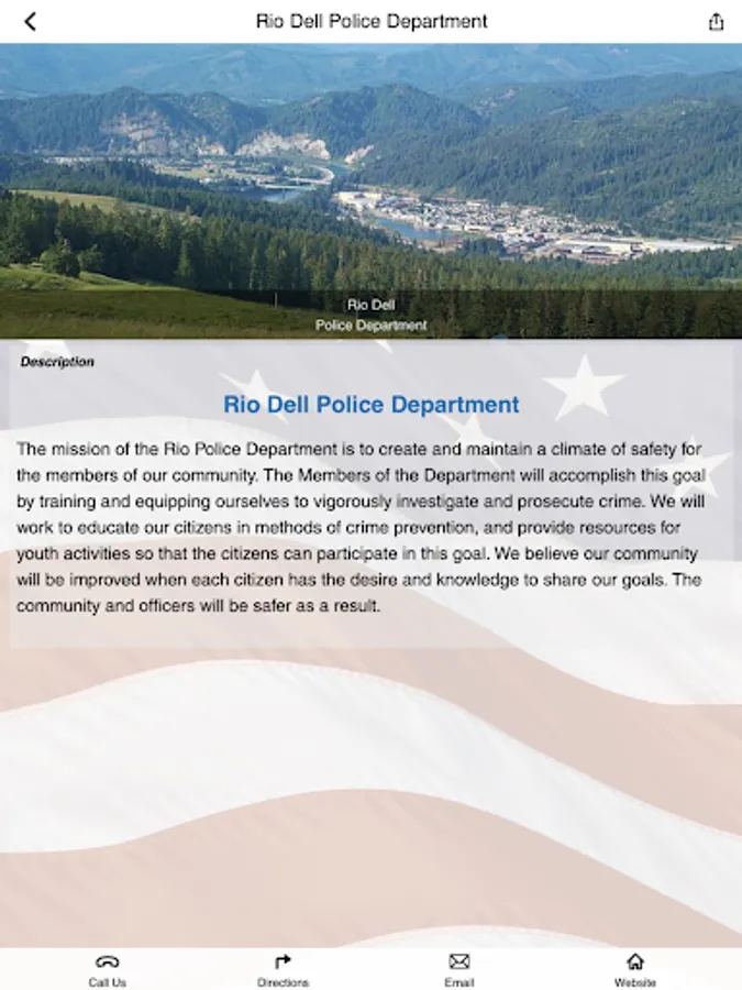 The mission of the Rio Dell Police Department is to create and maintain a climate of safety for the members of our community. The members of the Department will accomplish this goal by training and equipping ourselves to vigorously investigate and prosecute crime. We will continue to work in collaboration with our community to ensure the safety and the well-being of the citizens of Rio Dell.