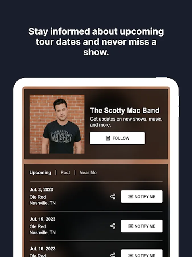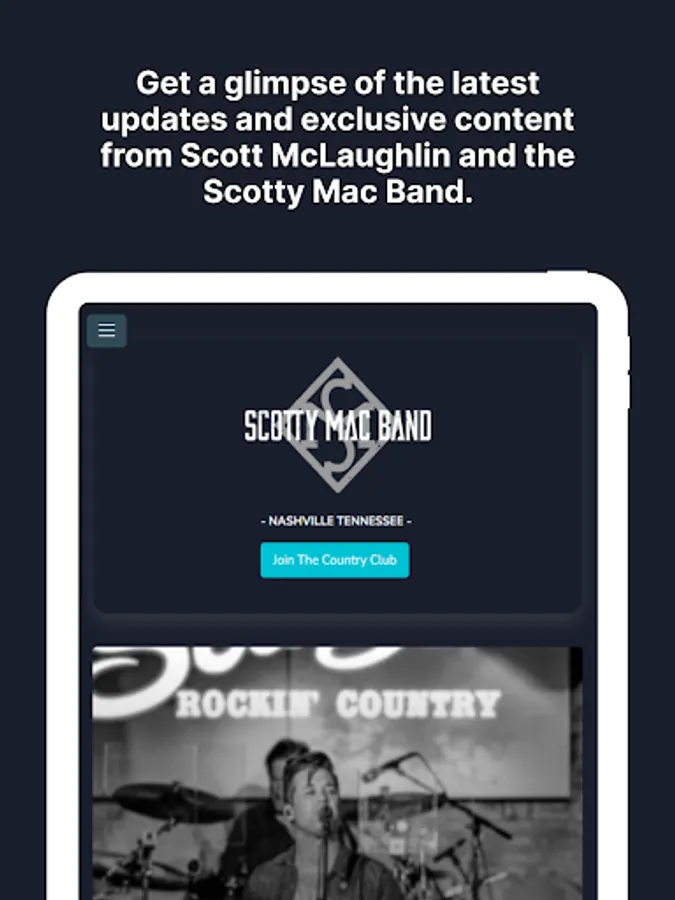 Welcome to the Country Club! Get behind the scene access to Scott McLaughlin and the Scotty Mac Band with our official app. Receive information about everything SMB directly to your phone so you are always up to date. Exclusive reminders, messages and video from Scott so make sure to receive our notifications. Never miss a show or a ticket give away again. Fans make our world go round. Let us treat you to the most cutting edge app technology so that we can easily stay connected. We are excited to have you as a member of our Country Club!