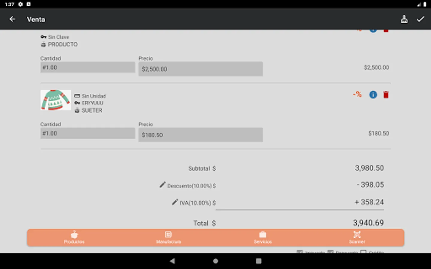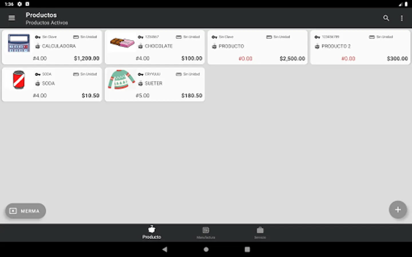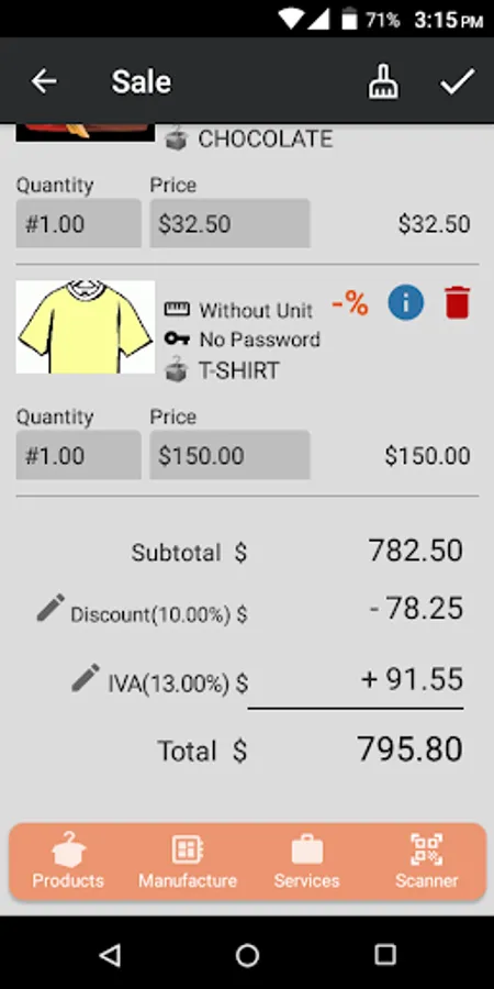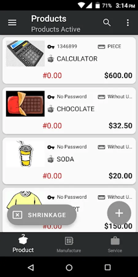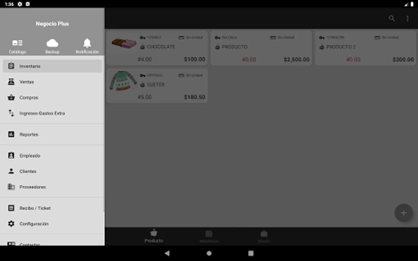 The application has options to manage the inventory of products, services, manufacturing (finished products and packages).