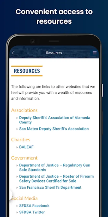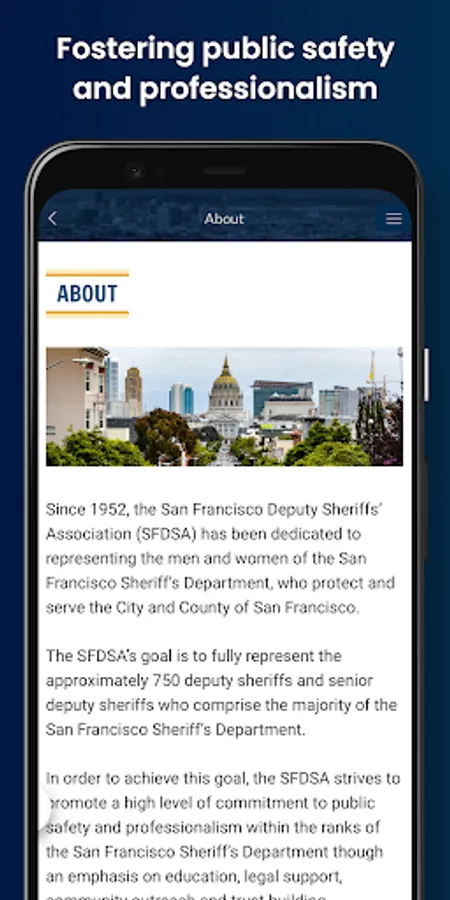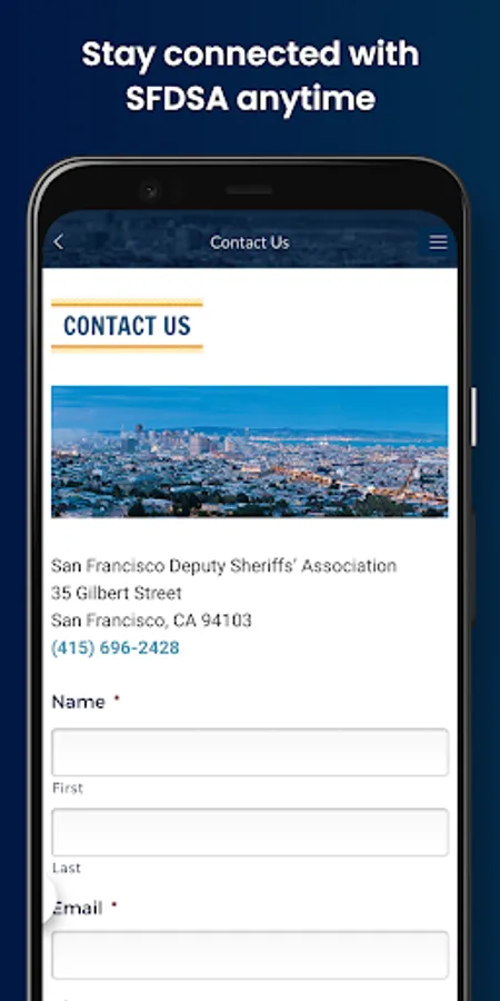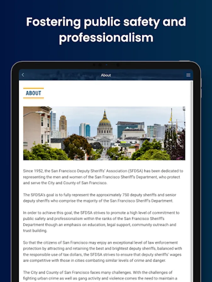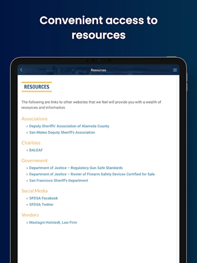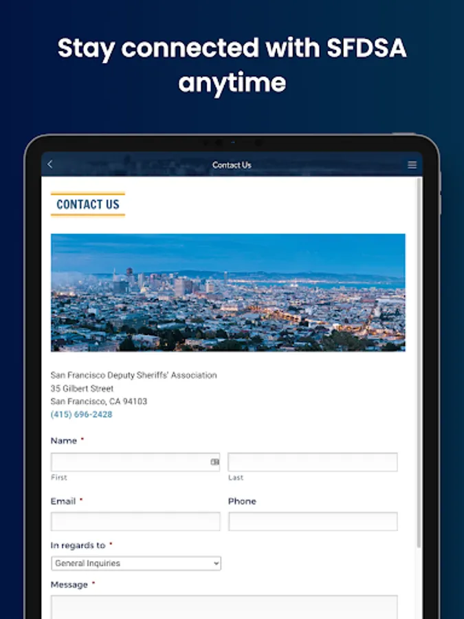 The San Francisco Deputy Sheriffs’ Association (SFDSA) app allows members to stay connected with their organization anytime, anywhere. The app provides important information and services, including access to member news and events, legal assistance, Board contact information, tickets and discounts, and much more!