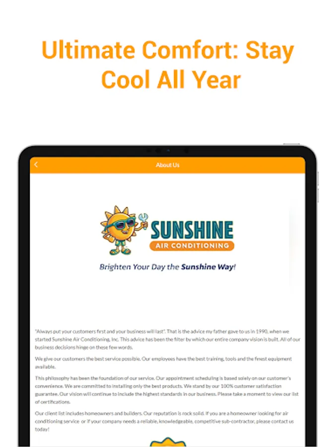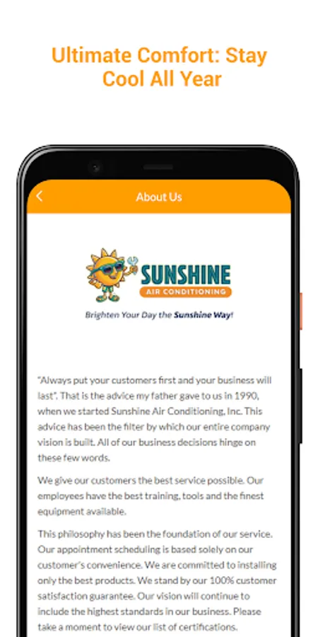 “Always put your customers first and your business will last”. That is the advice my father gave to us in 1990, when we started Sunshine Air Conditioning, Inc. This advice has been the filter by which our entire company vision is built. All of our business decisions hinge on these few words.