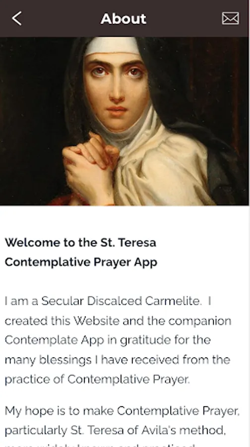 The St. Teresa of Ávila Contemplative Prayer mobile app is packed with features to help you learn and practice St. Teresa’s way of prayer, the Prayer of Recollection, and become more familiar with the teachings of the Catholic Church on Contemplative Prayer.