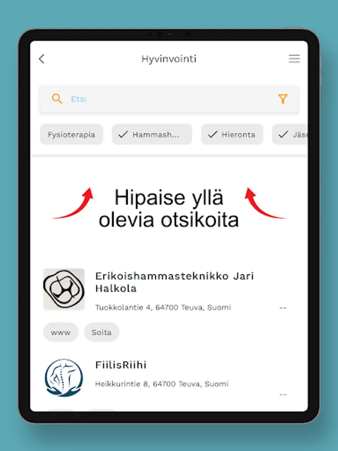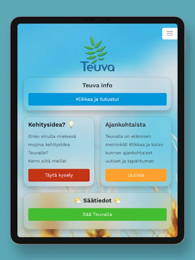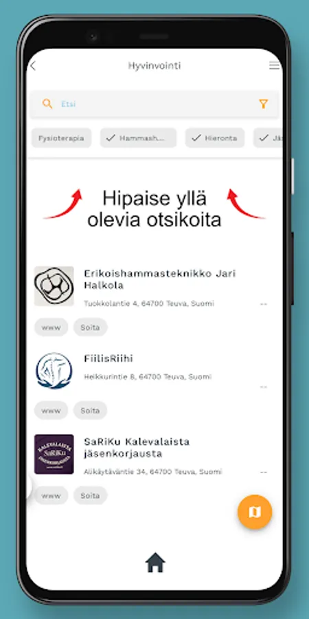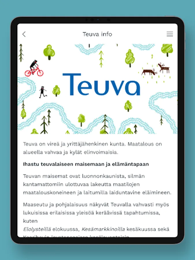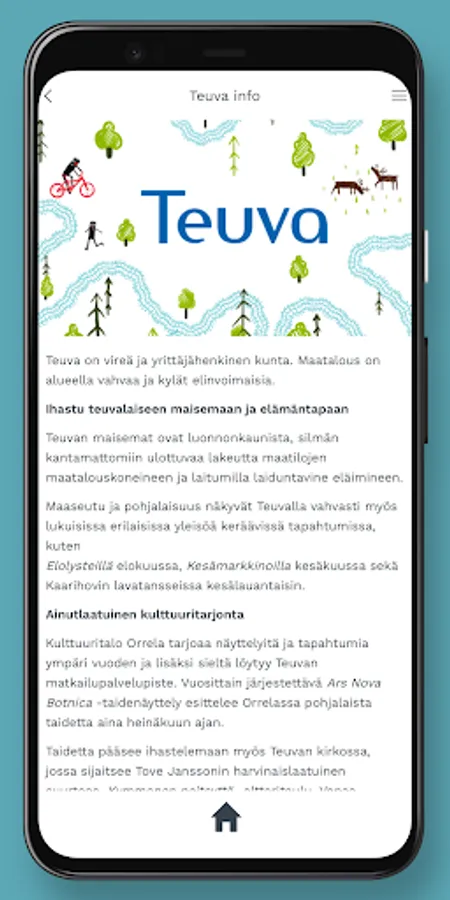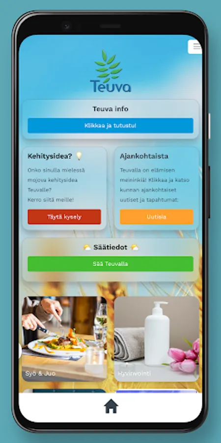 This free Teuva application brings up-to-date information about the municipality's events, services and news to your phone in an easy-to-use way that effectively utilizes the device's features! With the help of the application, you can see the locations and distances of the services on the map, and with a couple of taps you can start a call, email or navigate to your desired destination. By accepting PUSH messages, you can also receive bulletins, messages and useful news!
