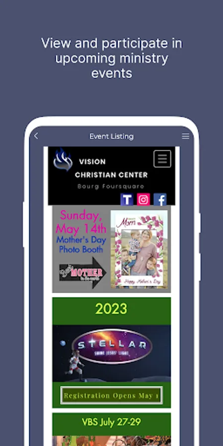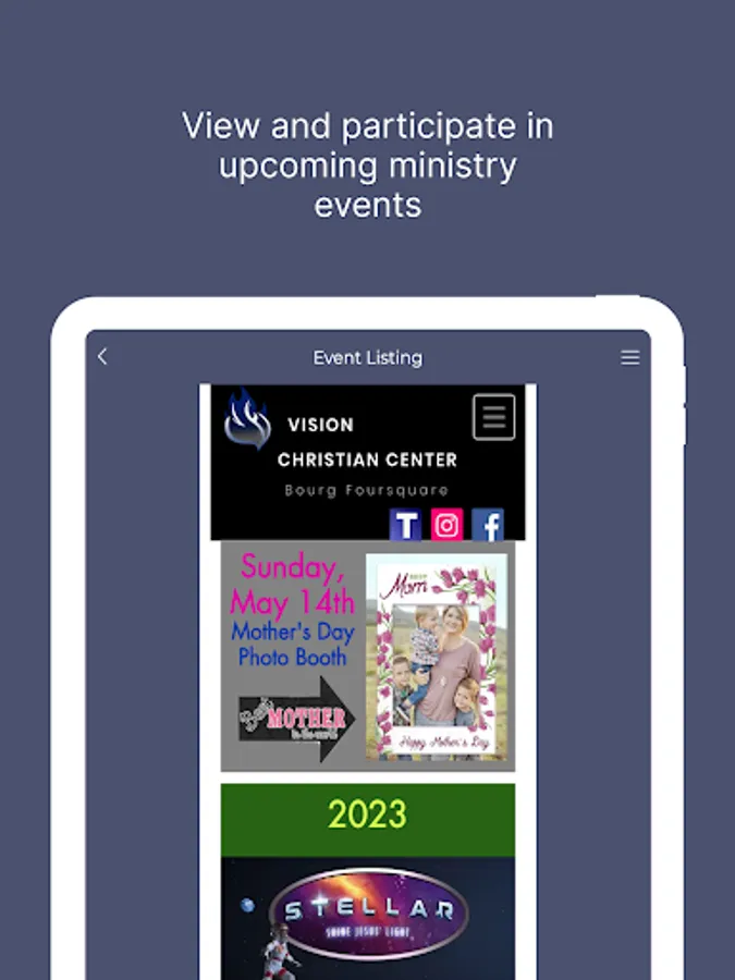 • Church Events - view current and upcoming ministry events.