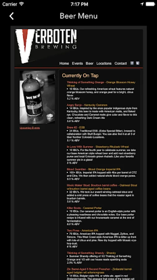 This is the mobile app for Verboten Brewing. Verboten derives its name from the forbidden ingredients that were rejected by the German Purity Law for beer, the Reinheitsgebot. Under the purity law, beers could only be made with three ingredients: barley, water and hops. Yeast, once its fermentation properties were clearly understood, was added later. Verboten's beers will embrace the trend of incorporating fruit and spice, barrel aging and other distinctive ingredients and processes to make our craft beers.