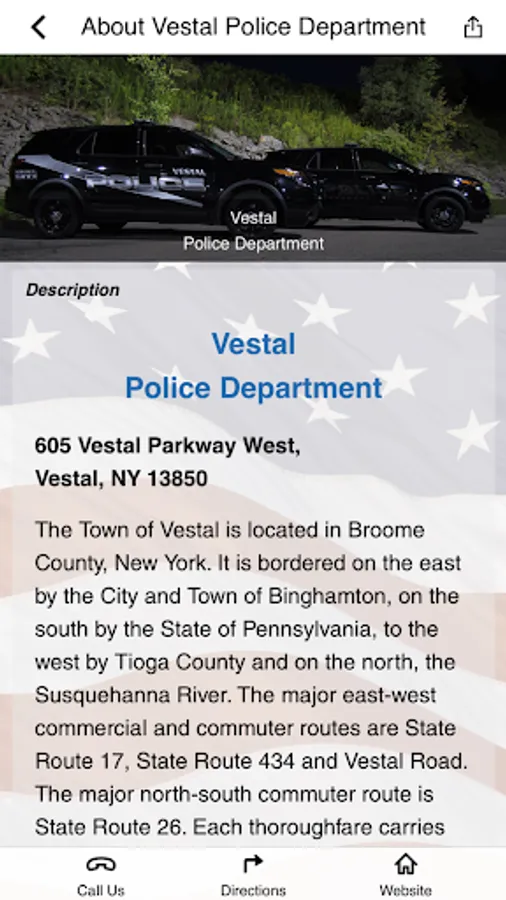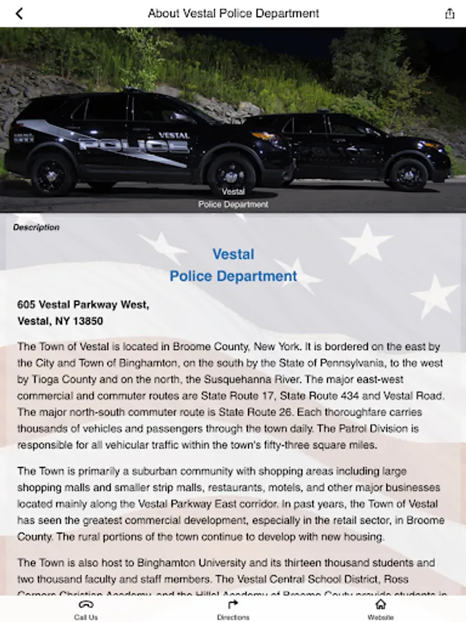 On behalf of the men and women of the Vestal Police Department, welcome to our app. This app is for the employees and family members of the Vestal Police Department, as well as the community it serves. It contains information about our department as well as safety and crime prevention tips. Vestal Police Department employees will have access to a full range of wellness tools.
