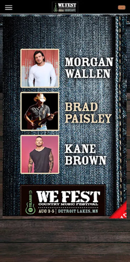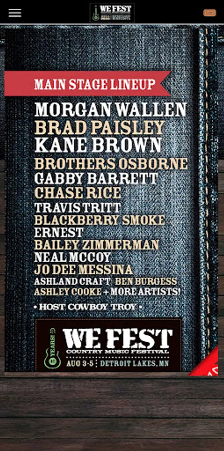 Essential to maximize your WE Fest Country Music & Camping Festival experience. Get updates, notifications and announcements. User-friendly venue maps, performance schedules, artist information and fun games. Connect on social media and the Fan Wall.