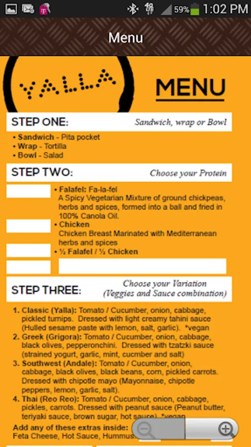 Yalla Truck provides healthy and delicious Middle Eastern / Mediterranean street food with a twist. We serve different global variations of common Middle Eastern street foods such as Falafel and chicken kabob pita sandwiches, wraps and bowls along with mouth-watering sides such as Hummus and French Fries.