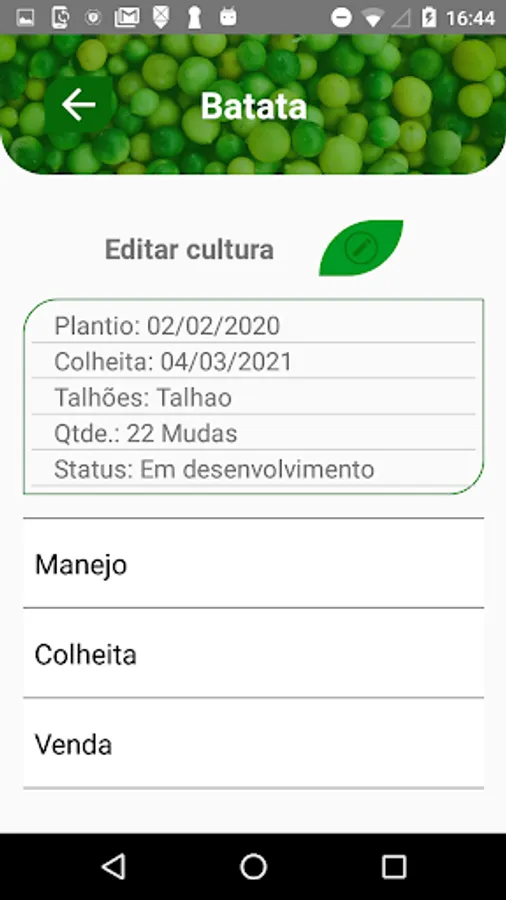 Além disso, é possível analisar relatórios de plantações e vendas, e envia-los por e-mail.