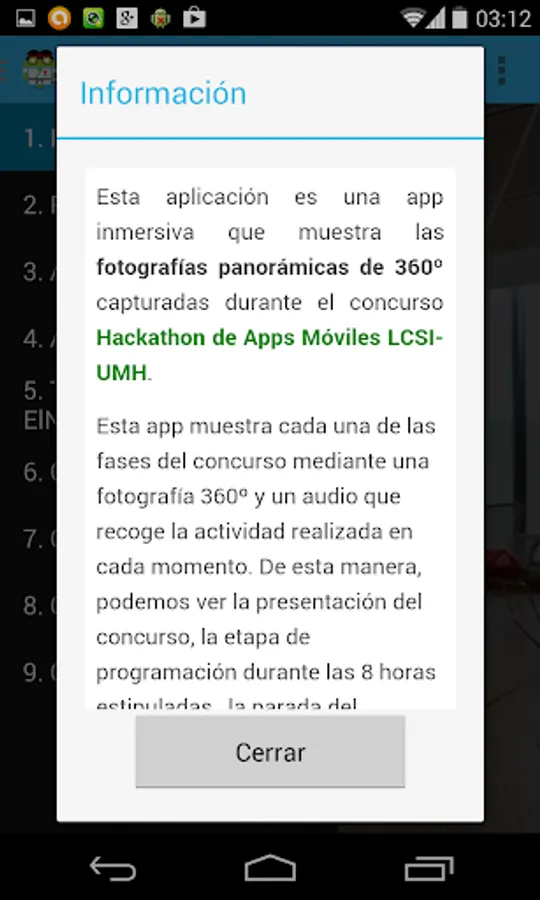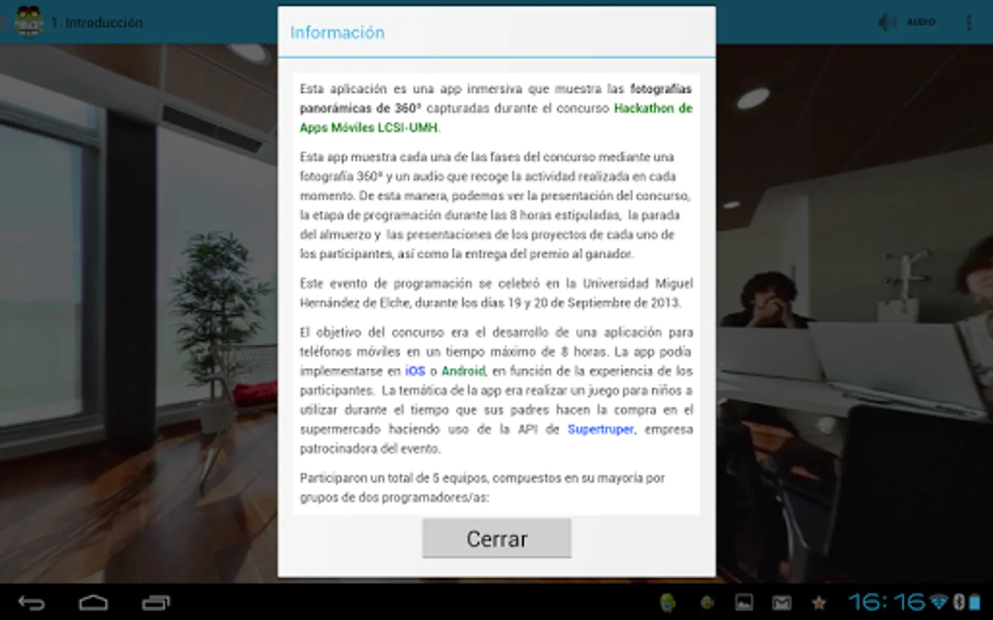 This application is an immersive app that displays 360 degree panoramic photographs captured during the Mobile Apps Hackathon contest LCSI-UMH.