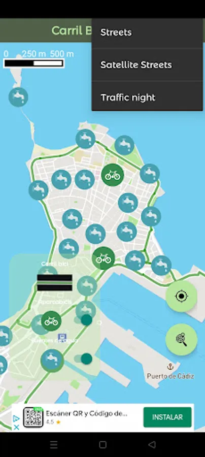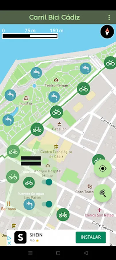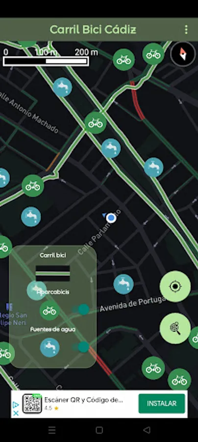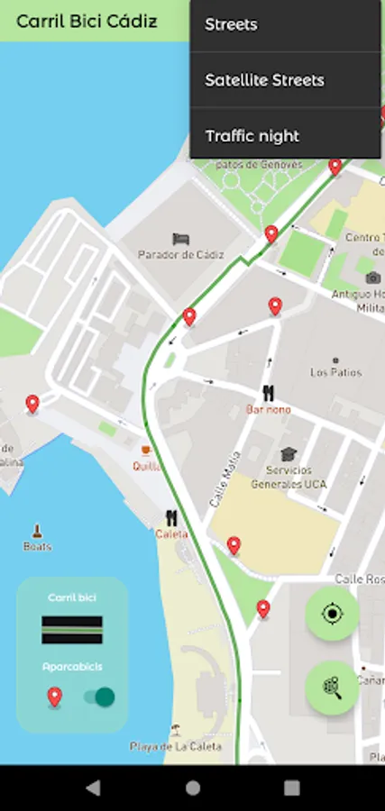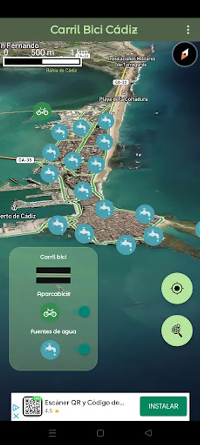 This App includes a map with three layers: Bike lane, municipal bike racks and existing drinking water sources in the city of Cádiz. It also has four cartographic bases for a better user experience. Geolocation in real time.
