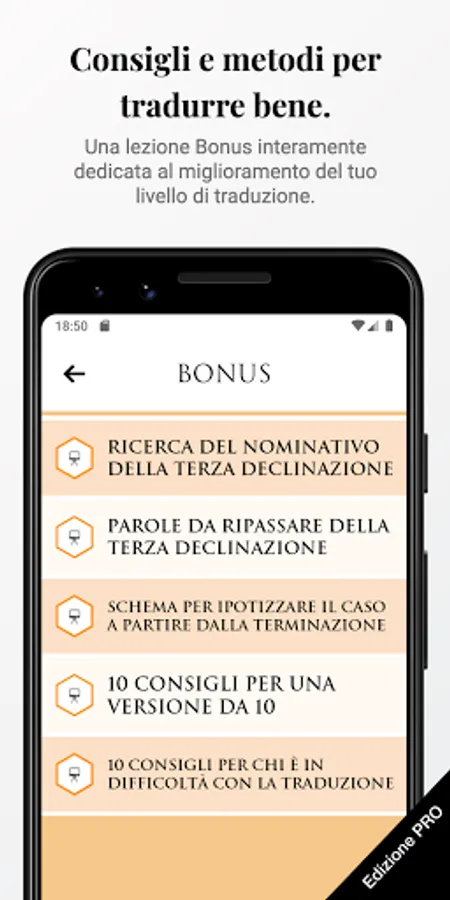 - [PRO] BONUS study unit, dedicated to enhancing translation, with techniques and tips to improve and to correct common mistakes that are made during translation.