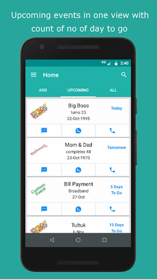 From the app you can send WhatsApp message or SMS with best wishes or just make a call.You can choose in what time app should remind you about Birthdays and anniversaries. Also you can snooze the reminder for any time if you are not free when the app reminds you.