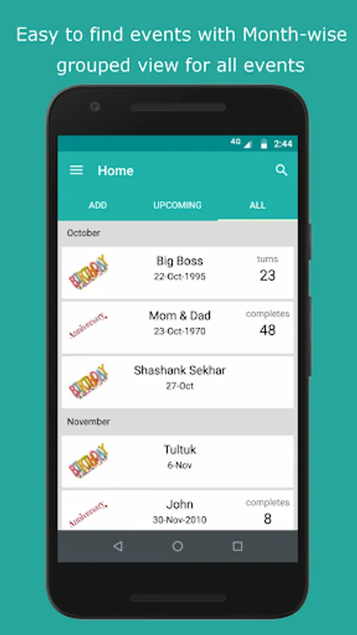 It's a Birthday Anniversary Reminder App as well as Birthday Reminder App with upcoming events, age, Alarm, Reminder via Email, Online Notification, import from contacts, Notification, custom alarm tone, Import and export and snooze alarm facility. It is also an all in one reminder as user can add custom events too.