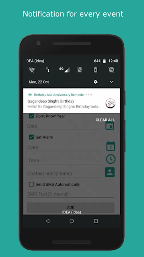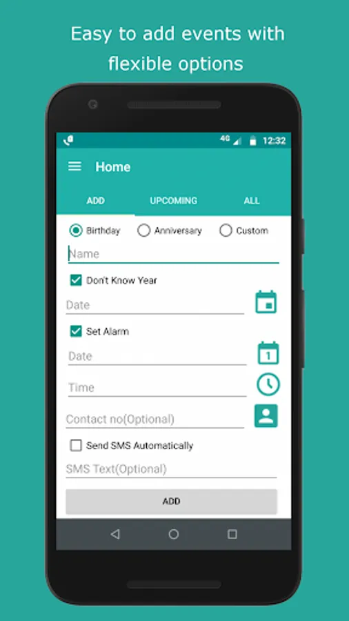 In this app user can add any number of birthdays, anniversaries and custom events. User will get notification at midnight on the date of events. On clicking on notification a view will open with option to wish via call, WhatsApp and SMS. User can set to send SMS automatically for any event at the time of adding them or they can update it latter. User can set alarm to ring it at particular time for every event. At the time of alarm rings, user will get a view having three option Snooze, Wish and Cancel. On clicking on wish button user will get option of calling directly from this app, Send message via WhatsApp and send SMS.