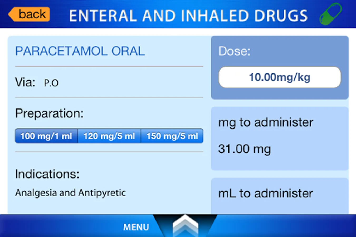 The professional must type in the child's Age and Weight, and all functions in the application will be automatically adjusted and calculated