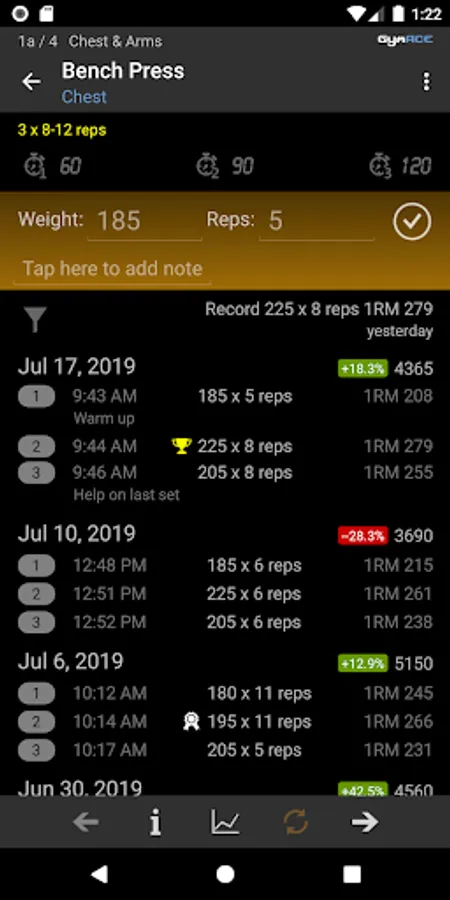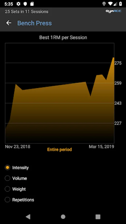 • Draws a graph of your One Rep Max, repetition, volume or weight history for each exercise.