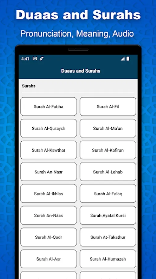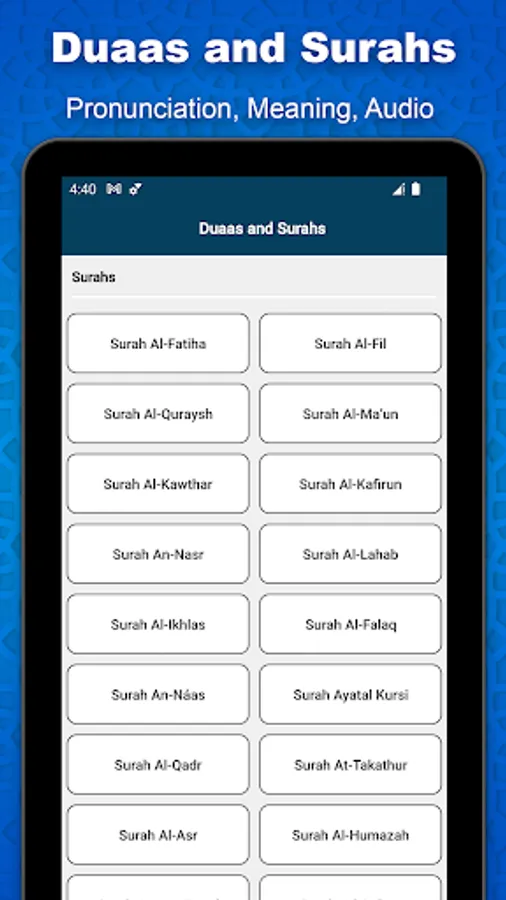 You can find Duaas and Surahs Pronunciations , Meanings, Sounds and videos.