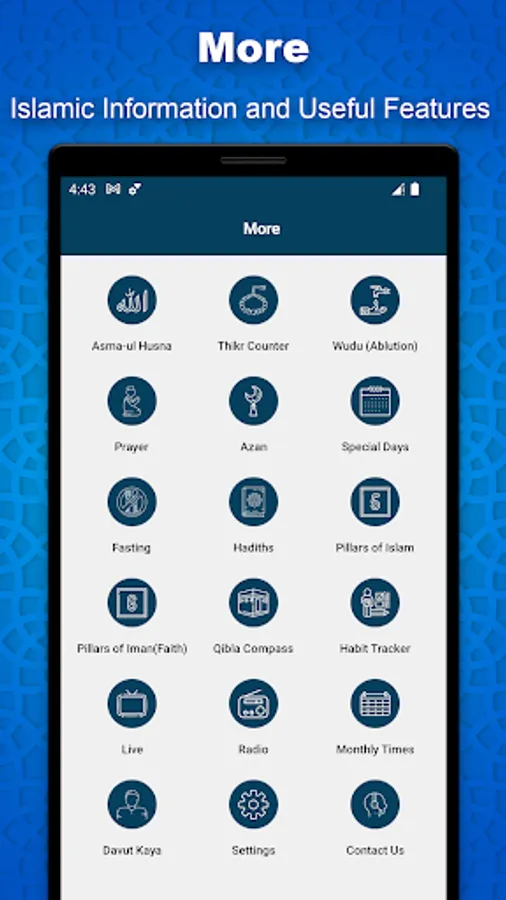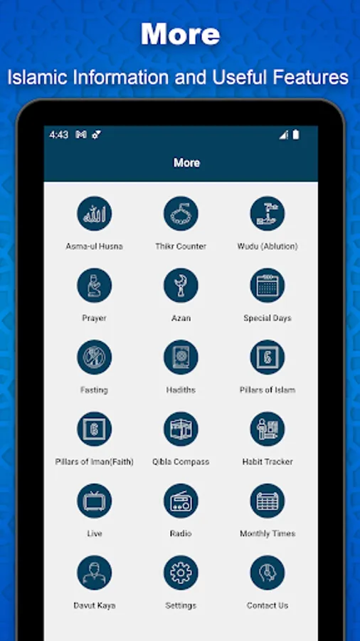The main categories are Duaas and Surahs, Azan, Wudu (Ablution), (Salah), Names of ALLAH, Pillars of Islam, Pillars of Iman, Thikr Counter, Duaa Community and Qibla Compass.