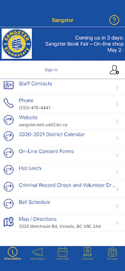 - Conveniently email, phone, or navigate to the school, or reach the website or social media.