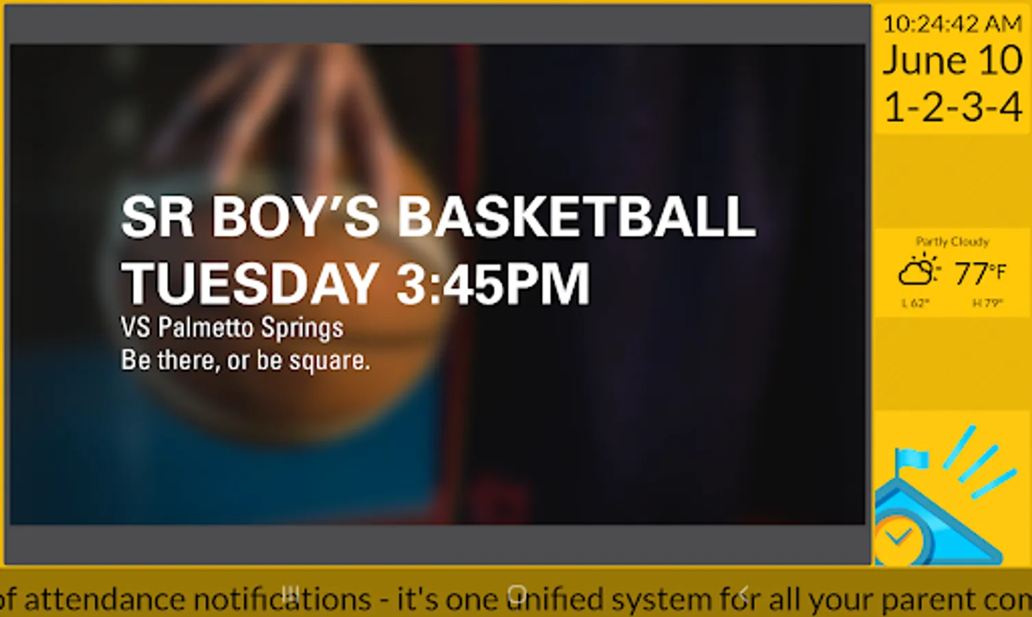 Show current events on your screens by linking a website calendar (including Google Calendar). Do you have staggered bell schedules? Is your high school on a block or day rotation? Keep your school on schedule with our exclusive features to automatically show current information on the screens. And don’t forget to post lunch menus and gym schedules - it’s effortless!