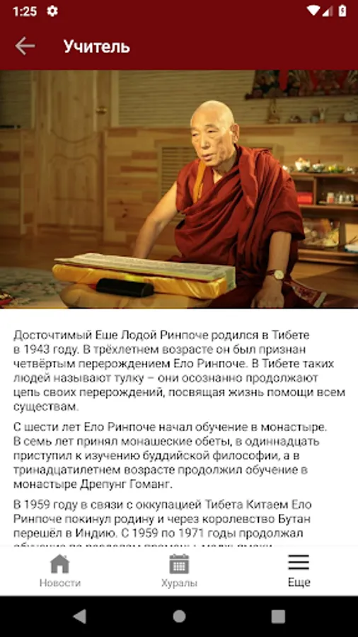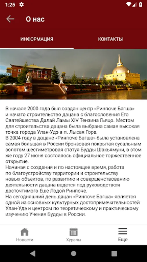 This application provides convenient access to detailed information about the datsan "Rinpoche Bugsha". In addition to general information about contacts and location with directions, you can learn about the history of the datsan and the biography of the venerable Yeshe Loda Rinpoche, also provides information about the rituals and prayers held in the datsan. Through the application you can access the official site datsan.