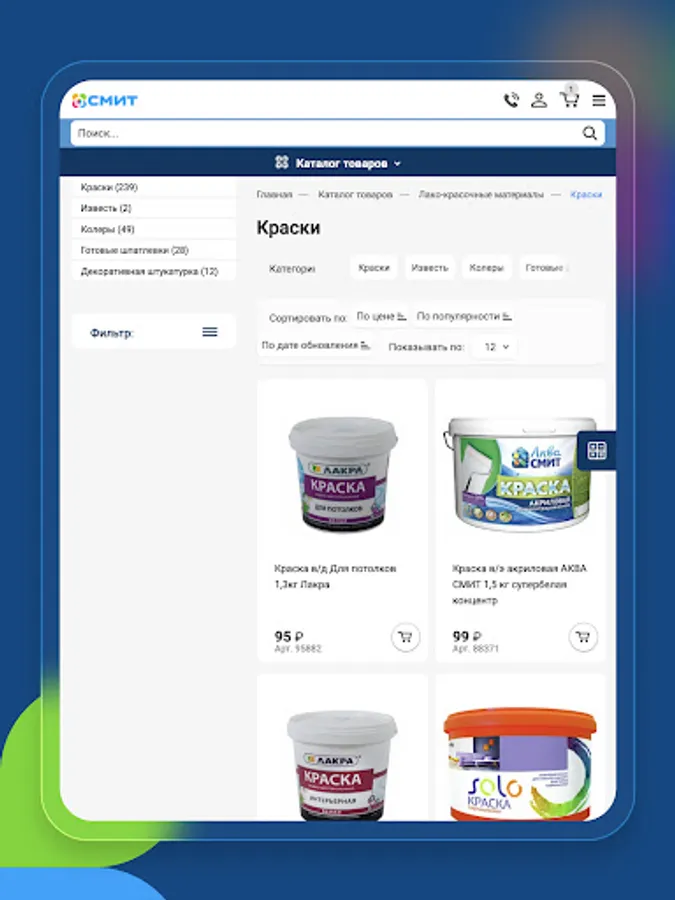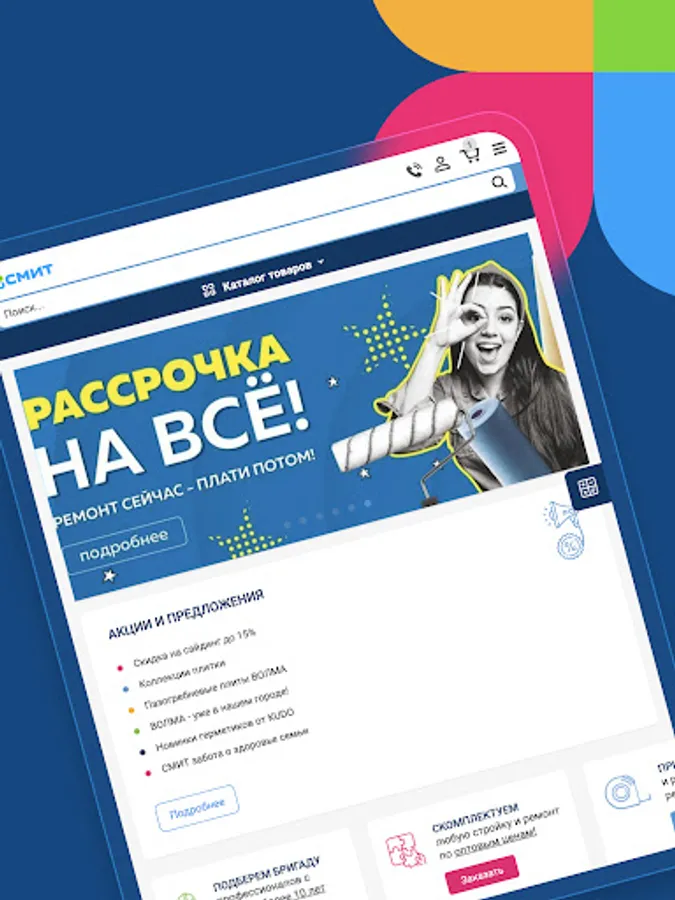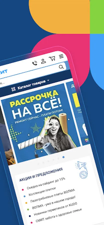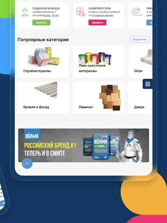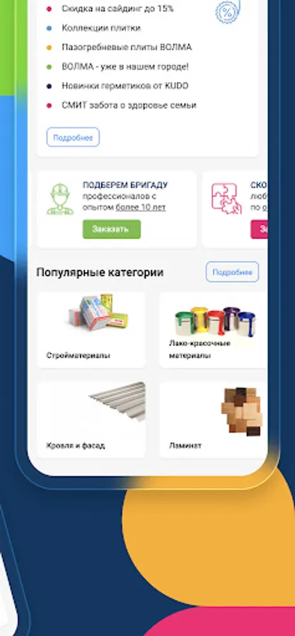 The assortment presented in the application includes tens of thousands of items of goods: construction, decorative and finishing materials, lighting and electrical goods, floor coverings and ceramic tiles, heating equipment, plumbing, water supply systems, tools, household goods, summer cottages and much more.