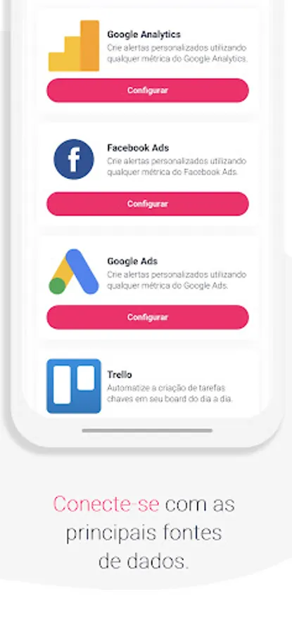 We connect your data sources with: Wake, Anymarket, E-complus, Facebook Ads, Google Ads, Google Analytics, Google Analytics 4, Jet, Ominichat, Plugg.to, Shopify, Trello and VTEX. If yours is not here, contact us; as our solution is built using the API First concept, which facilitates the rapid construction of new connectors.