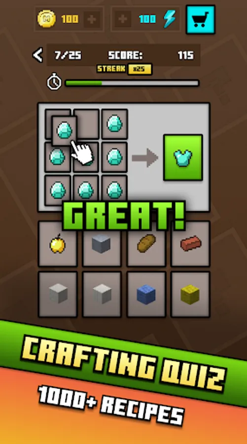 Mine-Crafter Quiz is a fun and interactive mobile app, designed for players and fans of the game who want to test their knowledge of Mine-craft recipes. The app features an extensive database of Mine-craft recipes that are commonly used in the game.