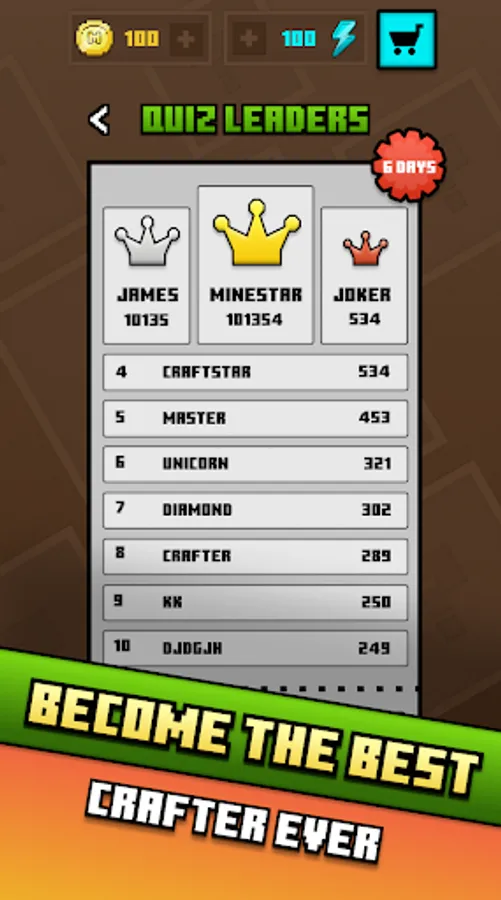 The leaderboard displays the scores of top players, and you can compete with others to get to the top of the leaderboard. Mine-craft Quiz is an excellent way to learn about the various recipes in Mine-craft while having fun and challenging yourself to improve your knowledge.