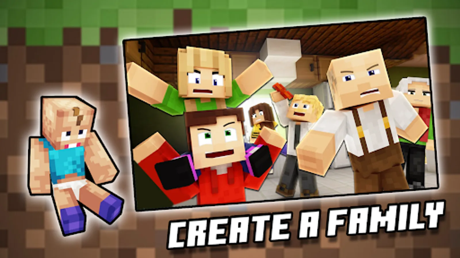 Happy Family for Minecraft PE is a free utility launcher for MC PE where you will find a whole family with the ability to marry, work and have children. Download and automatically install into the game through our launcher.